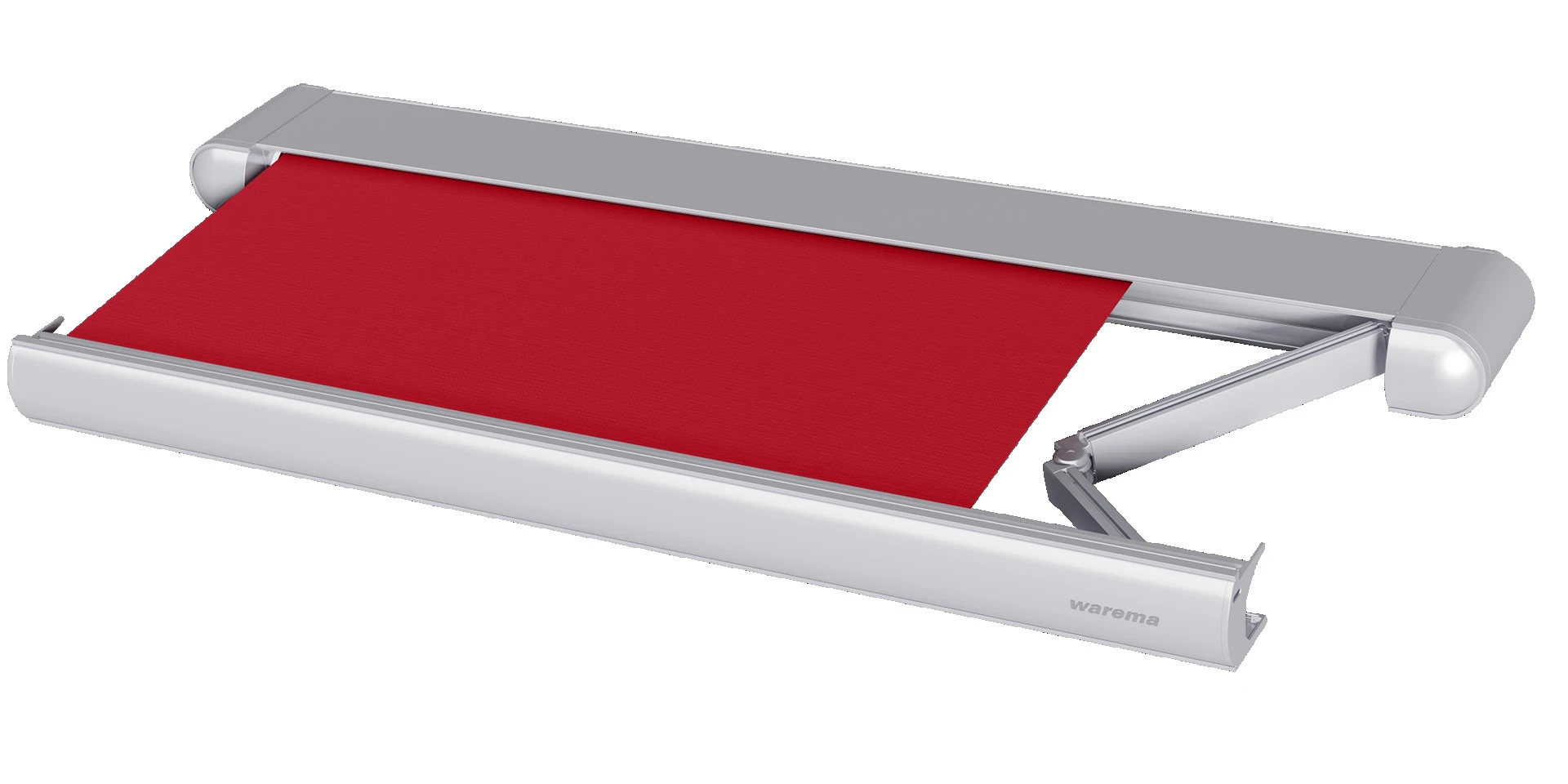 Rote Markise mit silbernem Rahmen und Gelenkarm